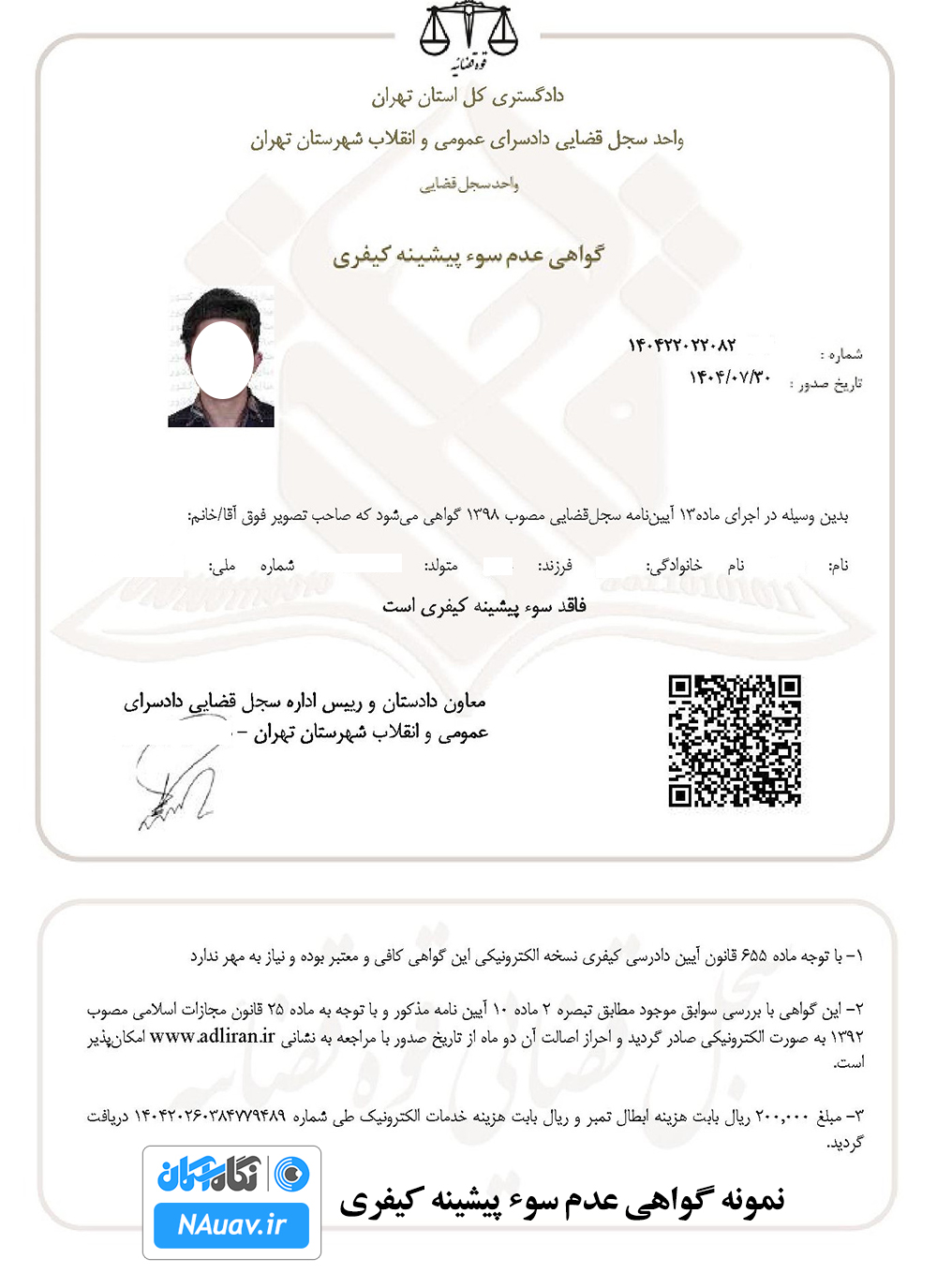 | تصویر اسکن شده از گواهی عدم سوء پیشینه | از سایت adliran.ir به صورت اینترنتی می توانید دریافت نمایید. از بخش «سامانه گواهی عدم سوء پیشینه» / گواهی قدیمی مورد قبول نیست و باید حداقل 30 روز اعتبار داشته باشد. نام این فایل باید به فرمت کدملی شخص و با فرمت jpg باشد. آموزش ارسال درخواست صدور گواهی عدم سوء پیشینه در سایت adliran.ir «برای دریافت گواهی عدم سوء پیشینه، نیازی نیست نام سازمان یا محل خاصی را وارد کنید. لطفاً گزینه «دیگر» یا «برای ارائه به جای خاصی نیست» را انتخاب نمایید.»  |